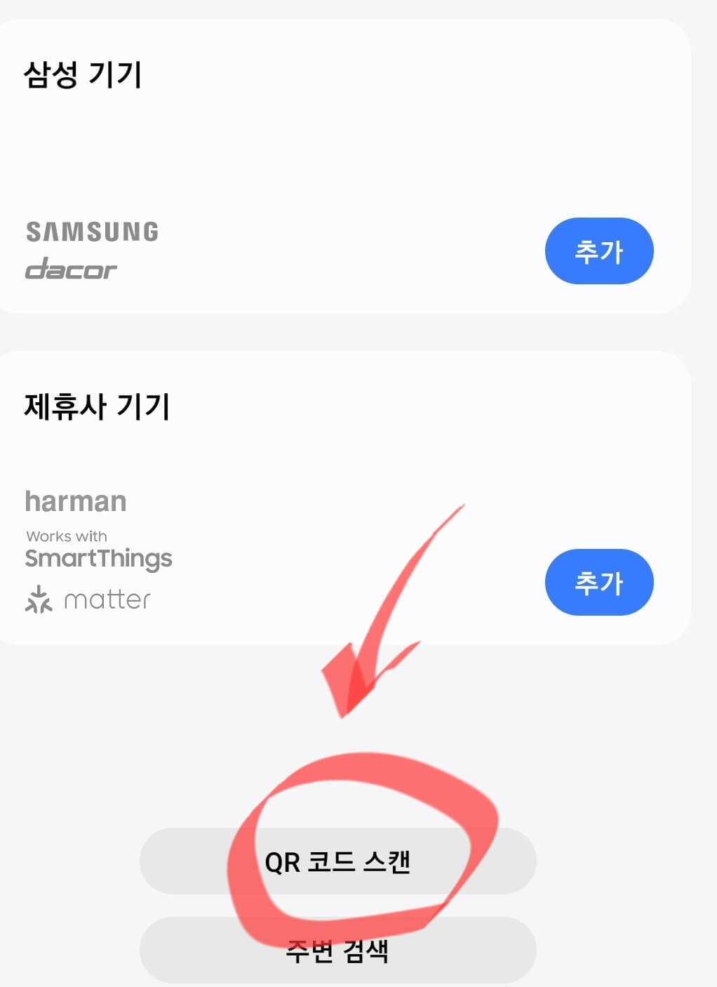 보통 에어컨을 자세히 보시면 모델에 따라 어딘가에 QR코드 스티커가 붙어있습니다. 스캔으로 추가하기 버튼을 눌러 카메라 화면에서 큐알코드를 인식해 주세요.