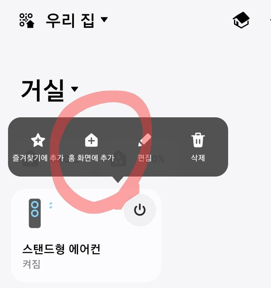 위젯을 등록하려면 앱에 연결해둔 기기목록을 손으로 길게 눌러주세요. 그러면 아래 화면처럼 홈 화면에 추가 버튼이 보입니다. 홈 화면에 추가를 눌러 위젯의 종류를 선택해 주세요.