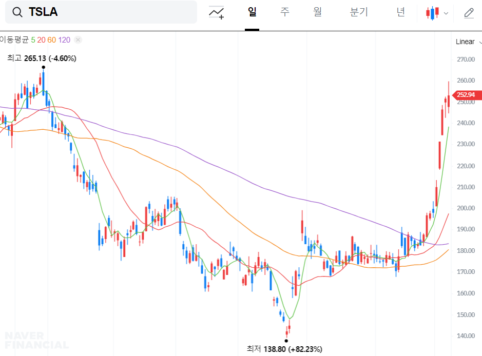 테슬라 주식은 주가 변동이 큰 종목 중에 하나입니다. 한때는 최고 265달러를 돌파했다가 계속 하락하면서 최저 138달러까지 내려간 적이 있습니다. 최근에는 250달러 선으로 다시 올라온 모습을 볼 수 있습니다.