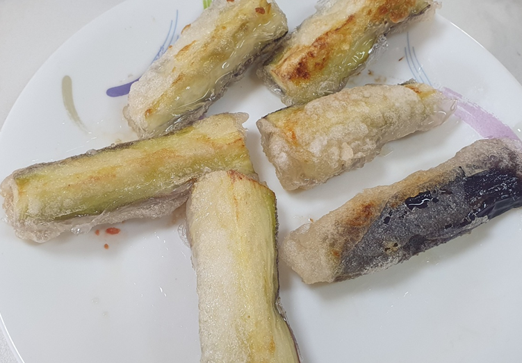 위 순서대로 준비된 가지를 팬에 기름을 넉넉하게 두르고 잘 튀기기만 하면 완성입니다. 튀길 때는 라이스페이퍼와 가지에서 나오는 수분 때문에 기름이 튈 수 있으니 조심하세요.