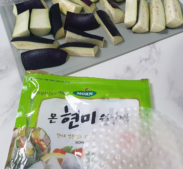 밑간을 마친 가지는 라이스페이퍼에 잘 감싸줍니다. 저는 일반적인 라이스페이퍼가 아닌 현미 라이스페이퍼를 사용했습니다. 집에서 월남쌈도 자주 해 먹기 때문에 라이스페이퍼는 한두 팩 정도 늘 집에 있는 식재료입니다.