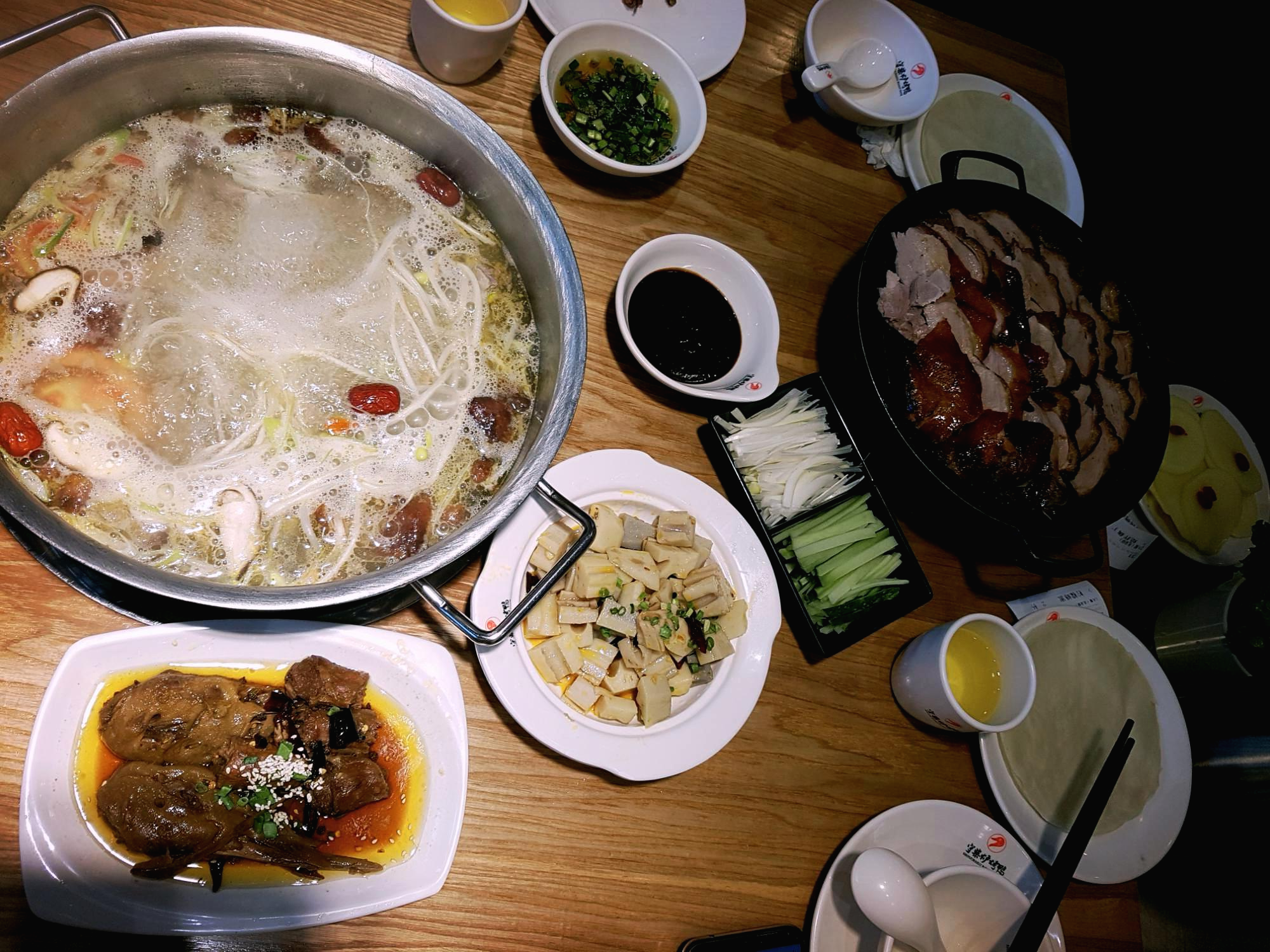 샤브샤브를 찍어 먹는 소스는 취향껏 제조할 수 있게 다양한 재료들이 구비 되어 있습니다. 친구가 만드는걸 눈치껏 보고 따라 만들어 봤지만 맛이 달라요.. 친구것을 뺏어먹어 봅니다. 이렇게 한상 가득 차려져 나오고 오리는 한마리를 주문했습니다. 음료도 두개 추가했는데 한국 돈으로 약 2만원 돈이라고 합니다. 한국에서 베이징 덕 사먹으면 얼마인가요.. 다시 한번 음식 가격에 놀라면서 '음식을 낭비하지 않겠다' , '언제 다시 올지 모른다'를 상기시키며 배가 터질때까지 먹어봅니다.