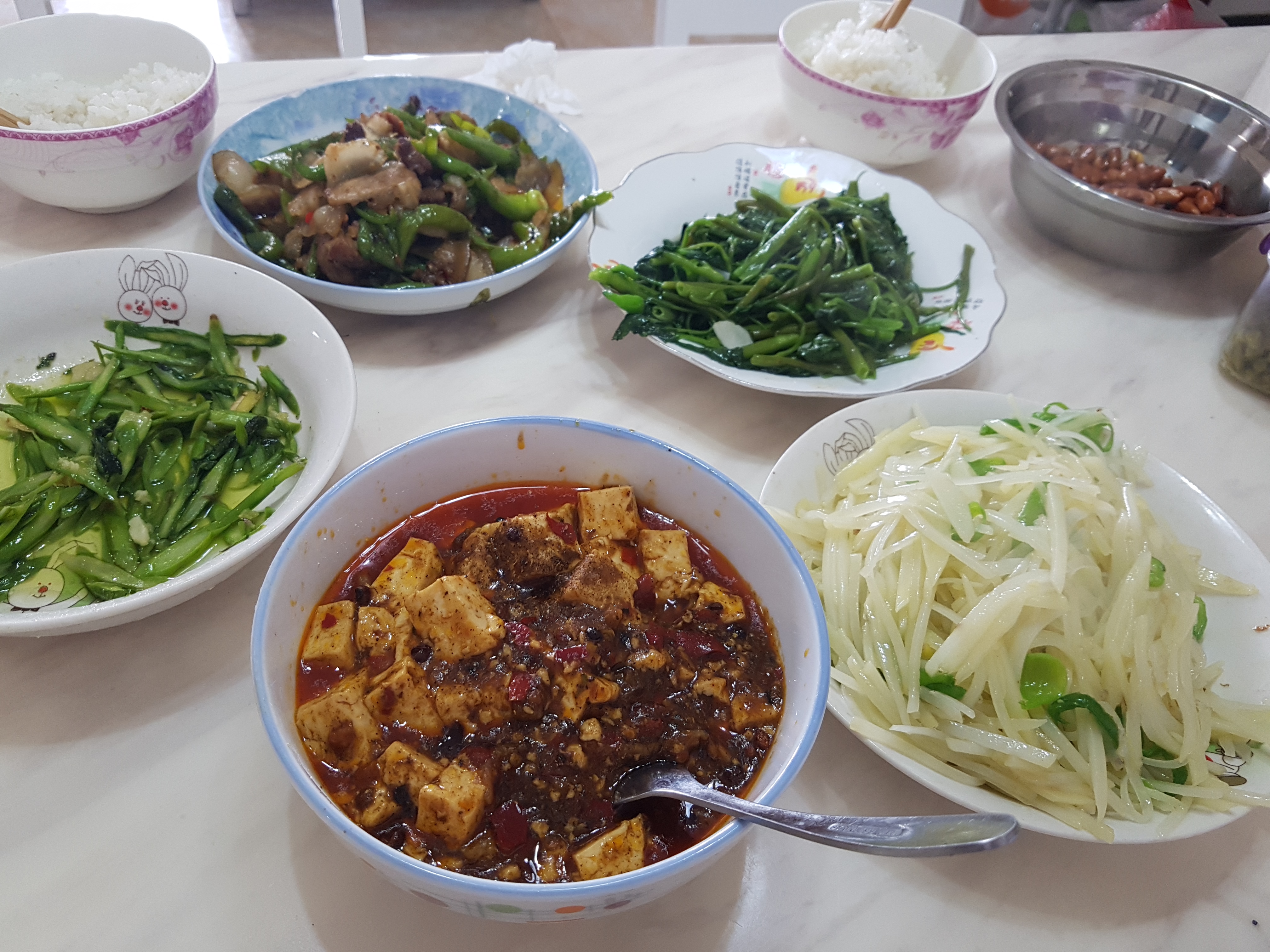 사진을 보니 또다시 맛이 생각나면서 군침이 도네요 ㅠㅠ 정말 단 하나도 맛 없는 음식이 없었습니다. 쌀밥과 궁합이 너무 좋았던 마파두부에 고추 고기 볶음도 개인적인 취향에는 너무 잘 맞았고, 감자볶음도 한국에서도 좋아하던 메뉴라서 정말 맛있게 먹었습니다. 식당에서 먹던 다른 밥들보다 더 맛있었던거 같아요... 우유 한병 먹어서 배부르다고 해놓고 오늘도 이렇게 일어나자마자 폭식을 합니다.