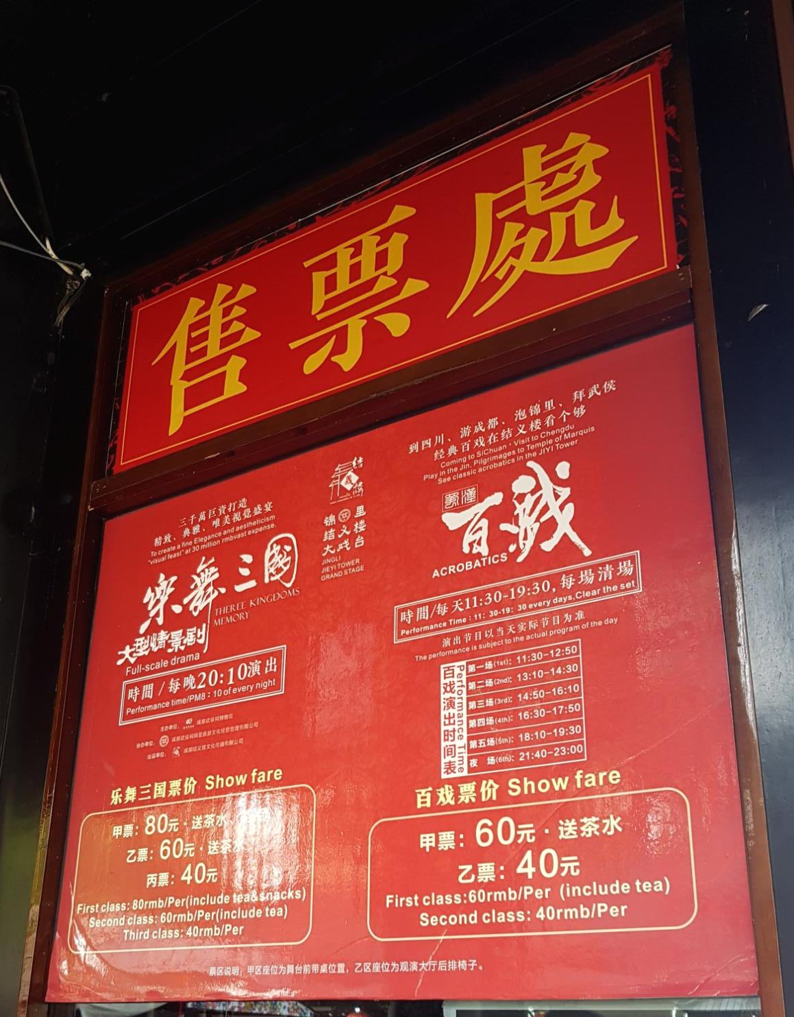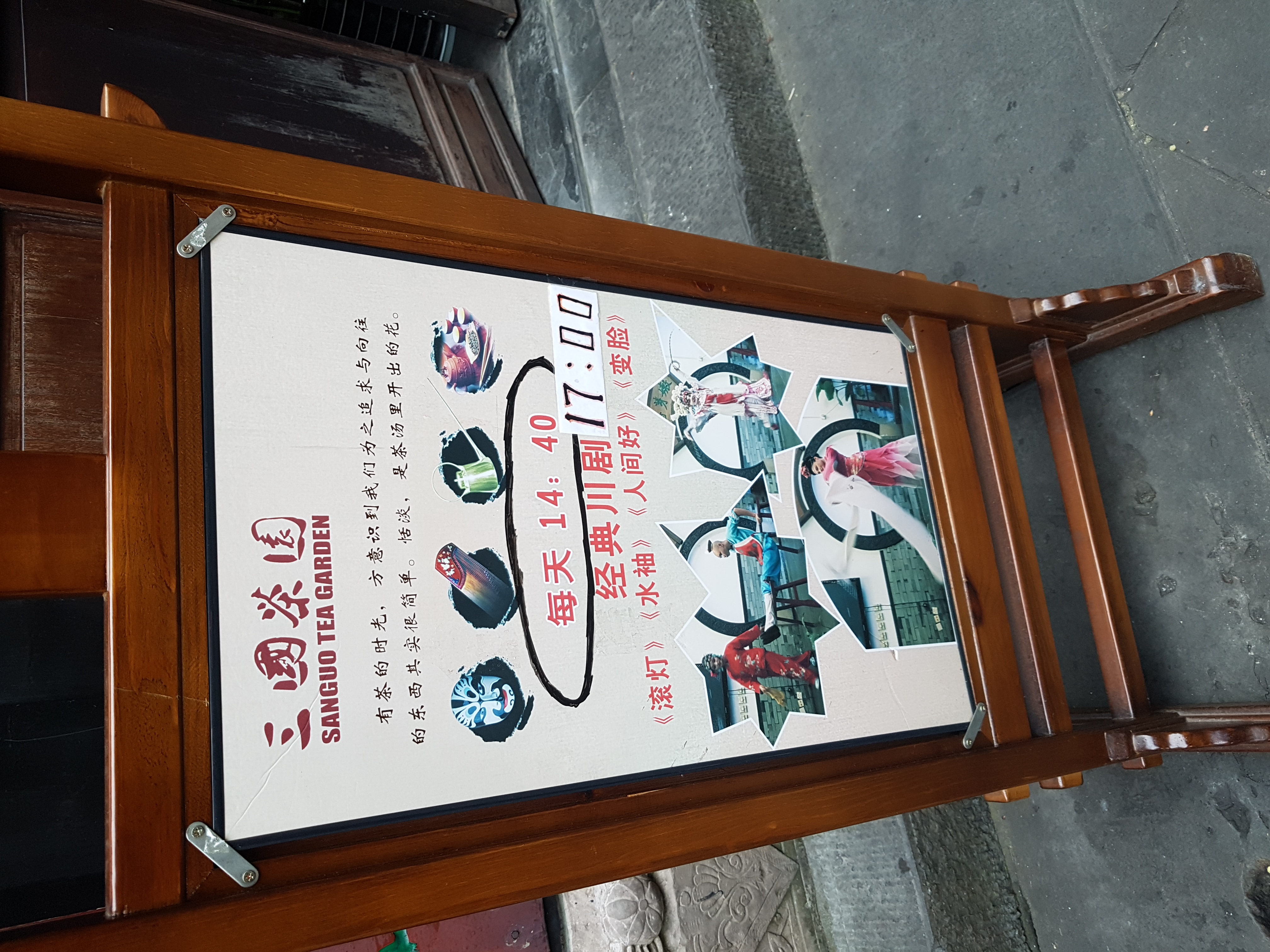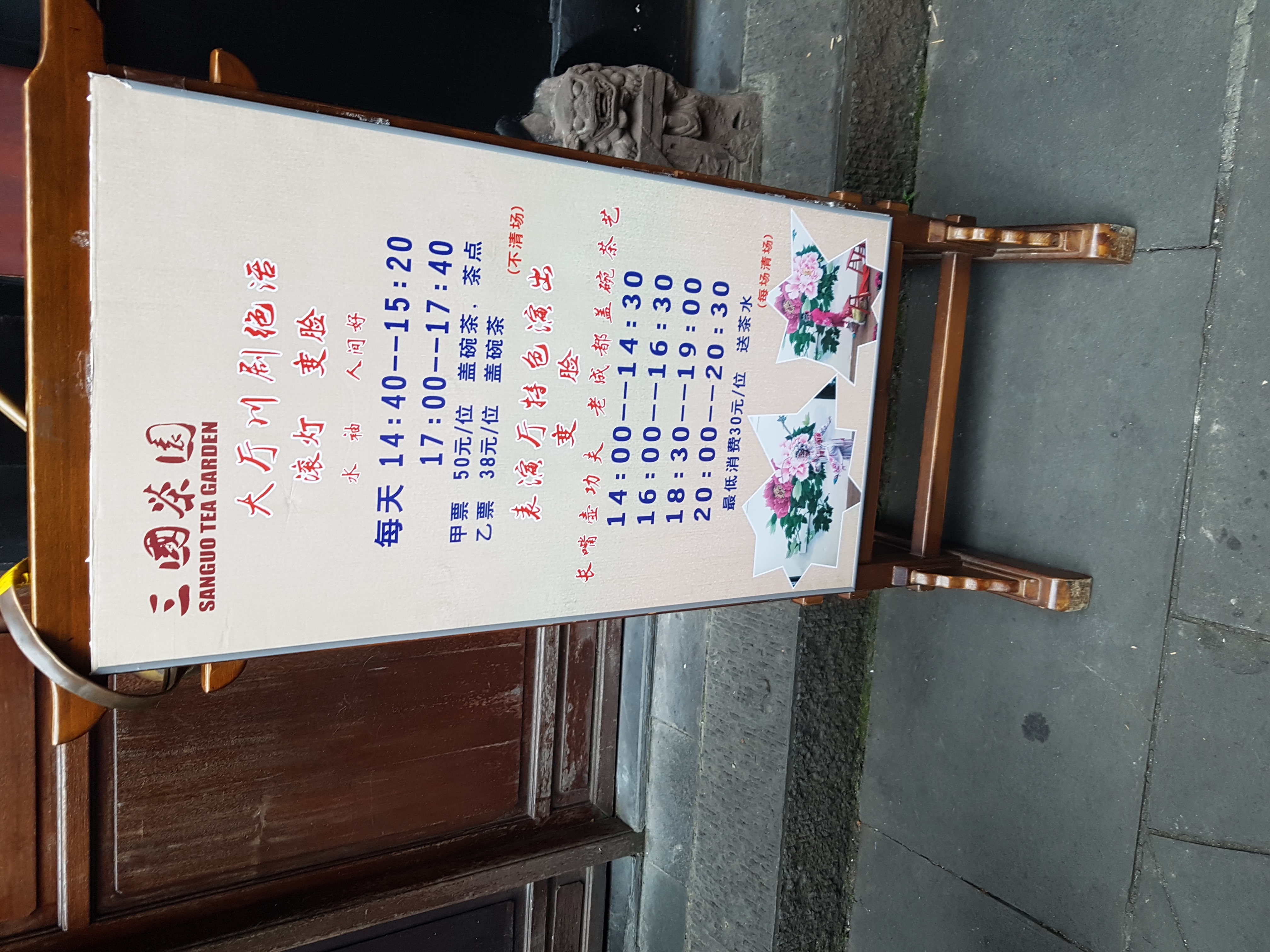 낮시간대라 아직 홍등에 불이 들어오진 않았지만 낮에봐도 예쁜 모습입니다. 중국풍 건물들과 분위기가 벌써부터 풍겨나오고 있어요. 진리에도 스타벅스 매장이 있습니다. 개인적으로 스타벅스는 콴자이샹즈 거리에 있는 스타벅스가 더 멋있었어요. 변검공연을 관람할 수 있는 곳이 몇군데 있다고 했는데 그 중 하나가 바로 진리거리 초입에 있습니다. 입구에 들어와 스타벅스 가 보이면 바로 그 옆 식당에서 차와 함께 변검 공연을 관람할 수 있습니다. 초입에 있는 공연장에서 하는 공연이 가격이 조금 더 저렴하고 시간도 더 짧습니다. 내부를 둘러보니 공연장이라고 하기엔 좀 작은 식당 혹은 찻집 같은 분위기에서 공연을 하는 곳이었습니다. 시간관계상 짧게 보고 싶은 경우, 공연을 아주 가까이서 보고 싶은 경우에는 이 공연장에서 변검공연을 보는 것을 추천드립니다. 초입에 있는 공연장의 공연 정보는 아래 사진을 참고해 주세요.