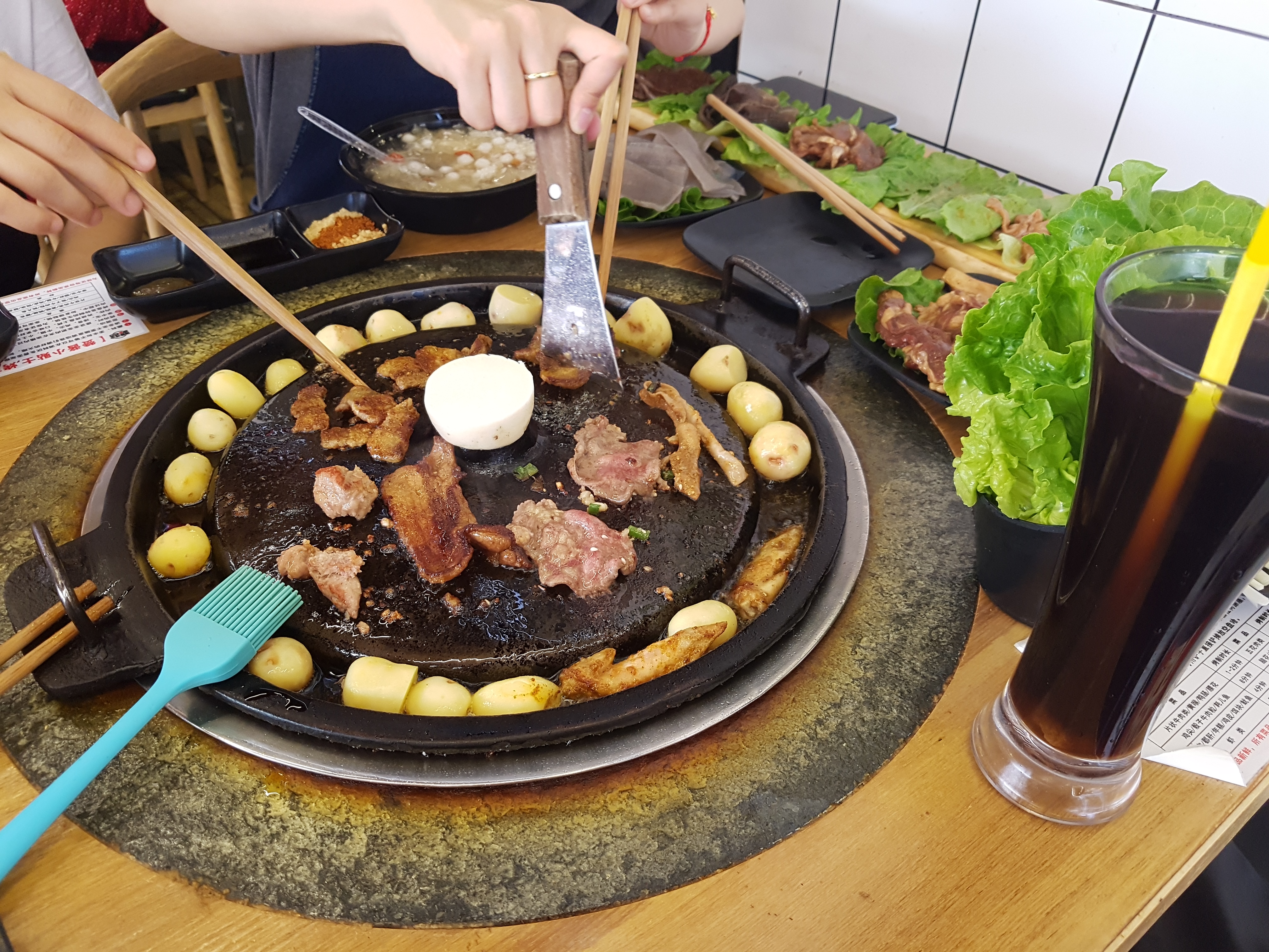 불판은 우리나라 곱창 불판과 조금 비슷하게 생겼습니다. 바베큐 요리에 약간 다른 점이 있다면 우리나라는 고기에서 나온 기름을 흘려보내며 고기를 굽는 형태인데 불판자체에 상당히 많은 기름이 둘러져서 세팅이 됩니다. 바베큐라기보다 바베큐와 튀김의 중간정도 되는 듯한 느낌이었어요. 특히 불판의 가장자리는 움푹하게 홈이 들어가 있고 그곳에는 익히는데 시간이 오래 걸리는 감자, 닭날개등을 두어 지글지글 끓여 요리해 먹습니다. 중국에서 지내는 동안 다양한 요리들을 먹어보며 느낀게 참 기름을 많이 사용한다고 느꼈어요. 닮은 듯 다른 형태의 바베큐 요리가 흥미로웠습니다.