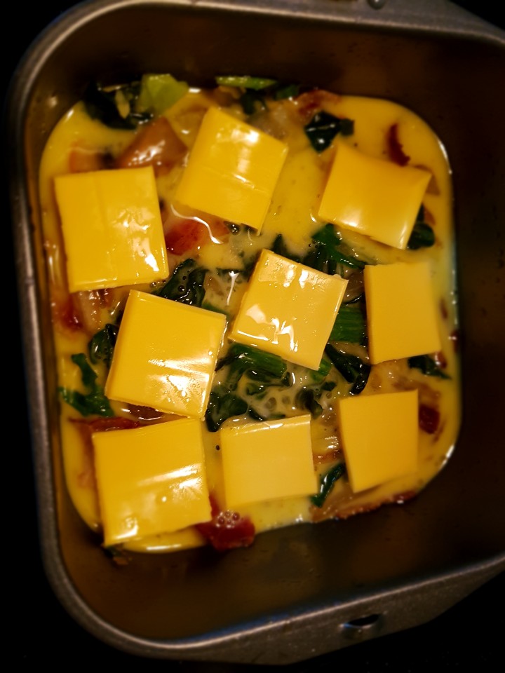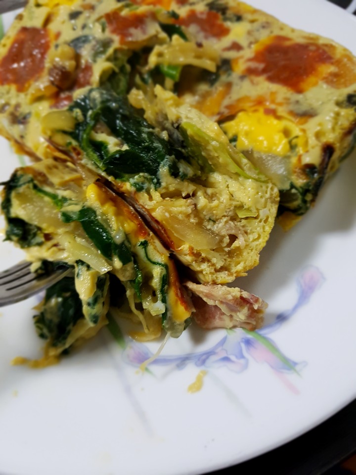 일단 10분 정도 돌리면서 익어가는 상태를 확인해 봅니다. 생각보다 여러번 돌렸던 것 같아요. 이미 다 익힌 재료로 만드는거라 그리 오래 걸리지 않을 줄 알았는데 중간 부분이 아직 많이 묽어서 온도를 낮춰 조금씩 더 돌려 주었습니다. 계란이 다 익은 걸 확인하면 꺼내줍니다. 다 만들고 나서 보니 만약 치즈를 넣으려면 일단 한번 계란이 어느정도 익을 만큼 에어프라이어를 돌려 준 후 나중에 넣어주는게 좋을 것 같았어요. 치즈를 올린 상태에서 오래 돌리니 치즈 색이 약간 탄것 처럼 변했는데 맛에서 탄맛이 느껴지는건 아니었어요.
