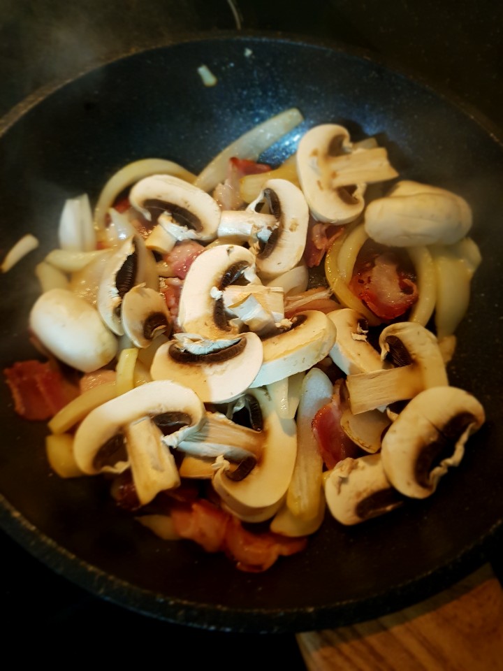 계란, 시금지, 양파, 양송이 버섯, 슬라이스 치즈, 베이컨 (우유, 편마늘, 청양고추 - 굳이 넣지 않아도 될 재료입니다 )