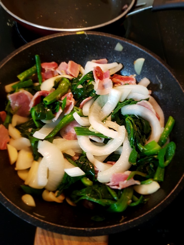 일단 가지고 있는 재료 중 시금치 프리타타에 활용할 수 있는 재료들을 모두 볶아 줍니다. 볶는 동안 아주 살짝 간을 하면서 볶아줍니다.