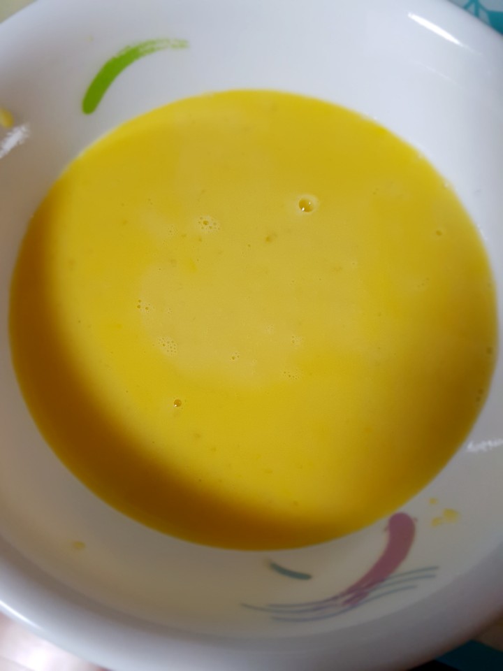 사실 토마토를 꼭 넣어야지 하고 생각하고 있었는데 마트에 갔을때 토마토 사는 걸 깜박했어요 ㅠㅠ 다시 사러 나갈까 살짝 고민했지만 귀찮으니 일단 있는 재료만 넣고 도전해 봅니다. 모든 재료가 어느 정도 숨이 죽어갈때 소금과 후추로 살짝 간을 해줍니다. 계란은 모든 재료가 담궈질 수 있는 양만큼 잘 저어 풀어서 준비해 줍니다. 저는 우유도 살짝 추가했어요.