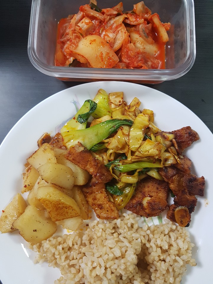이 날은 냉장고에 남아있던 재료가 삼겹살, 청경채, 양배추, 감자 였어요. 뭔가 아주 간단히 먹기보다는 어느정도 요리를 해먹고 싶은 마음이 들어서 감자조림과 삼겹살 채소볶음을 해먹기로 했습니다.