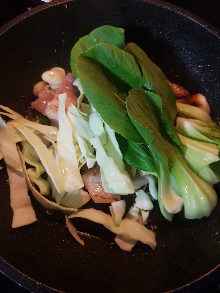 산지 얼마되지 않아서 채소가 정말 싱싱했어요. 양배추나 청경채는 워낙 좋아하기도 하고 요리하기 정말 쉬운 재료라서 채소를 사는 경우에는 꼭 구매하고는 합니다. 씻어둔 양배추와 청경채를 넣고 숨이 죽을때까지 잘 볶아 줍니다. 숨이 어느정도 죽기시작하면 소스를 추가해줍니다. 미리 만들어두고 추가하면 좋겠지만 혼자 해먹을때는 최대한 간단히 설거지를 줄이는 방법으로 조리합니다. 간장을 먼저 넣고 살짝 불맛이 나도록 기다려줍니다. 간장냄새가 확 올라오기 시작하면 재료들을 저어주다가 고추가루를 추가해 줍니다.