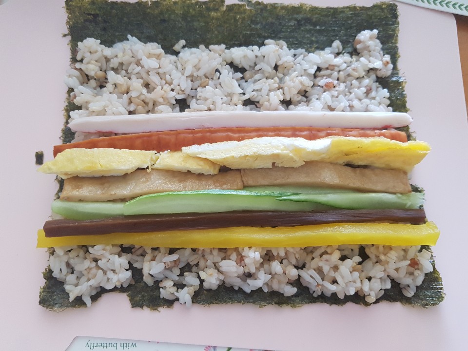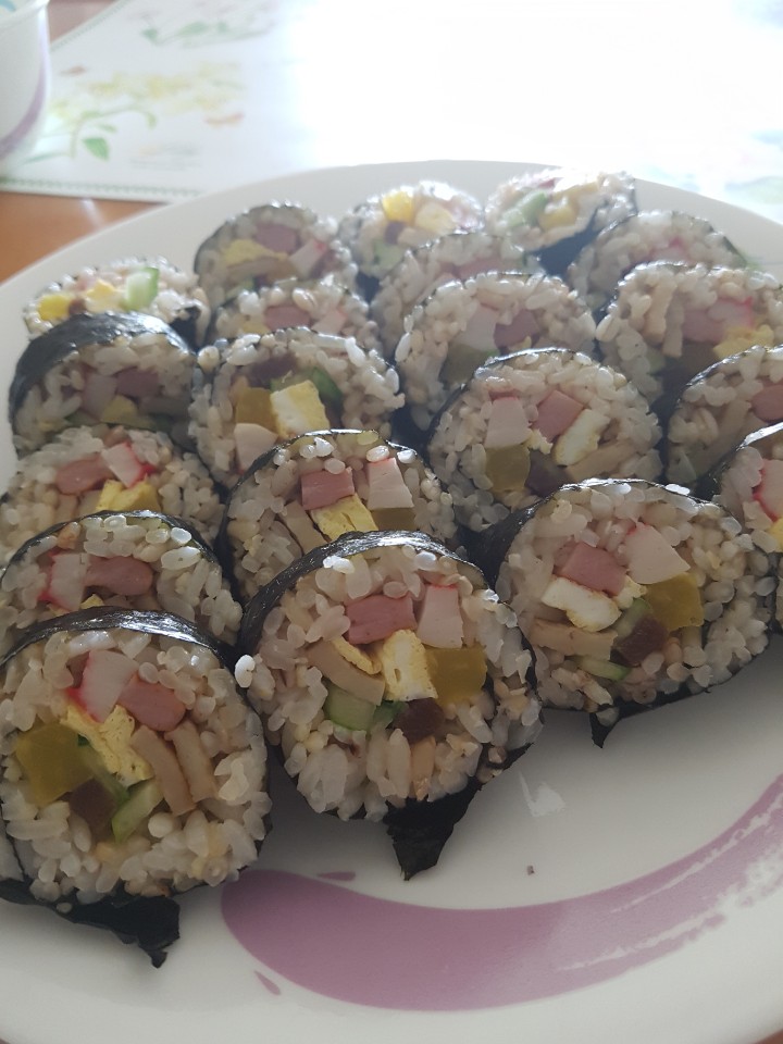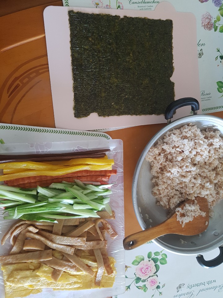 계란은 소금간을 살짝해서 지단을 만들고 오이도 적당한 크기로 채를 썰었습니다. 어묵의 경우 간장만으로 살짝 간을 하고 볶아 주었어요. 평소에는 콩과 온갖 잡곡이 들어간 밥을 만들어 먹지만 김밥을 싸기 위해서 콩, 흑미등은 빼고 몇가지 잡곡만 넣어서 밥을 지었습니다. 사실 흰 쌀밥이 제일 맛있지만.. 부모님이 당뇨가 있어 기왕이면 늘 잡곡밥을 먹으려고 합니다. 밥에도 참기름과 소금으로 살짝 간을 해줍니다.