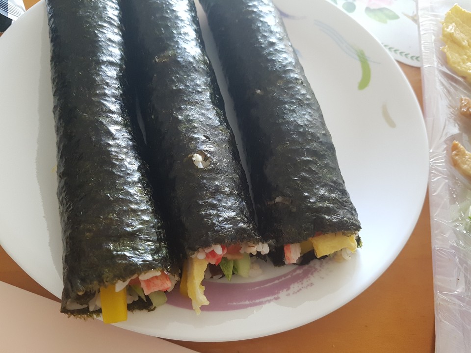 제가 일하던, 특히 호주에서의 스시 가게는 사각형에 가까운 모양으로 롤을 말고는 했습니다. 그 모양을 만들어볼까 시도해 보았지만 김발이 없어 모양을 잡기가 쉽지 않아 그냥 평범한 김밥의 모양을 만들었습니다. 김의 종류도 약간 다른지 여기저기 구멍난 곳도 많고 조금 더 얇고 흐물흐물해 지는 특성이 있는 것 같아요.