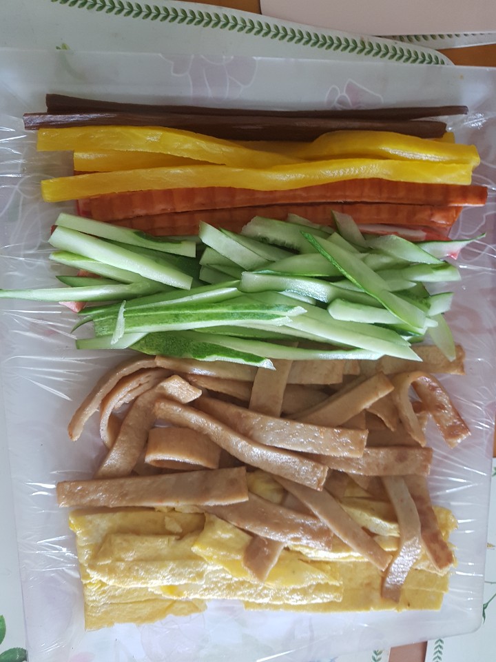 순서대로 재료를 잘 놓아줍니다. 개인적으로 좋아하는 김밥은 참치김밥이지만.. 있는 재료로만 만들어봅니다. 그래도 재료가 제법 푸짐합니다.