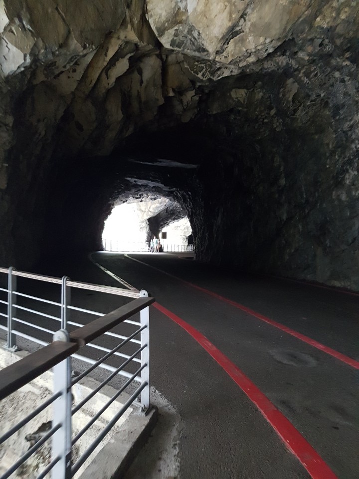 차도와 인도가 아주 가깝게 붙어 있기는 하지만 안전에 걱정될 만한 장소는 아닙니다. 인도를 따라 쭉쭉 걸어가시면 TV에서 자주 보시던 터널에 도착할 수 있습니다. 인도가 꽤 좁은 편이라서 마주오는 관광객이 있다면 잘 비켜서 걸어가셔야 해요.