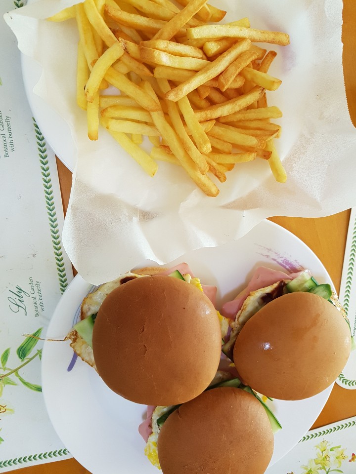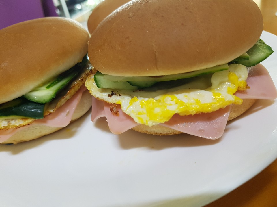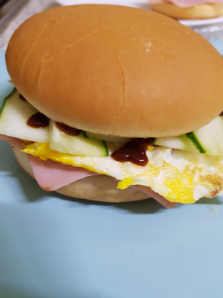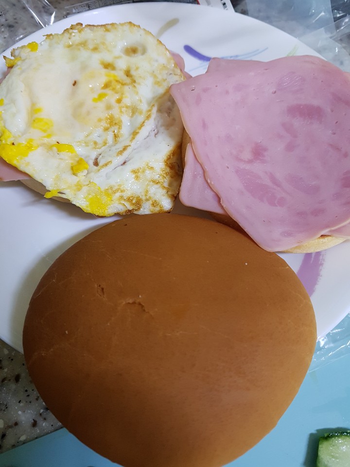 햄버거 하나에 샌드위치 햄 2장, 계란 후라이 하나씩을 넣어주었습니다.