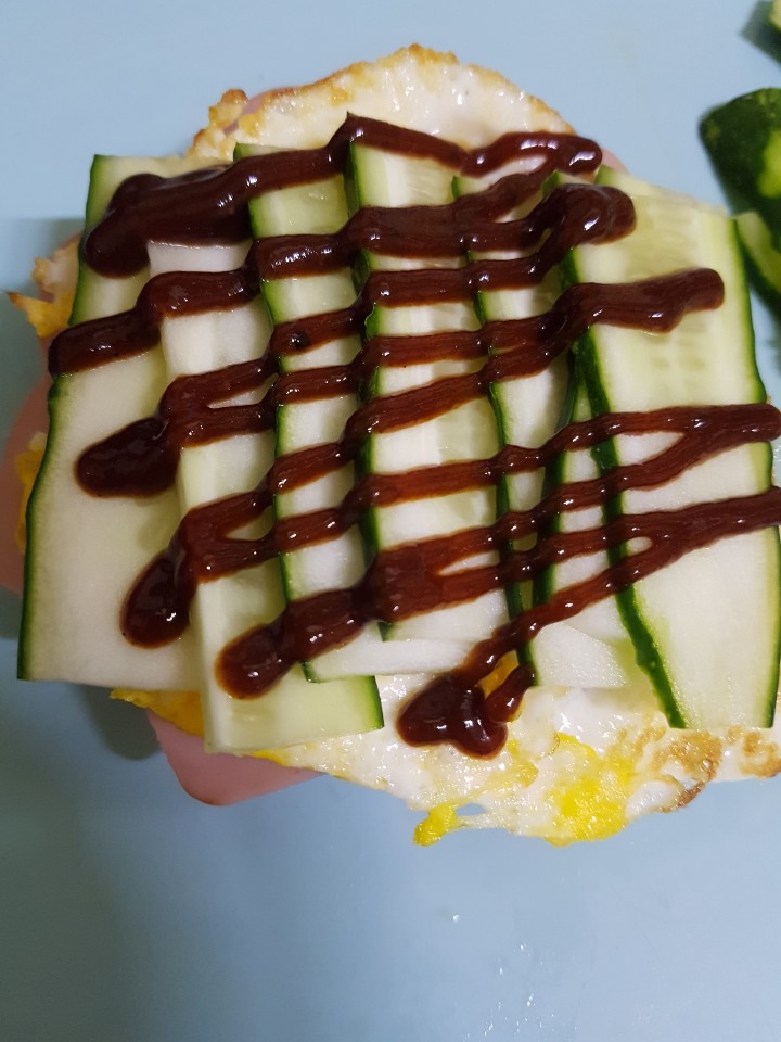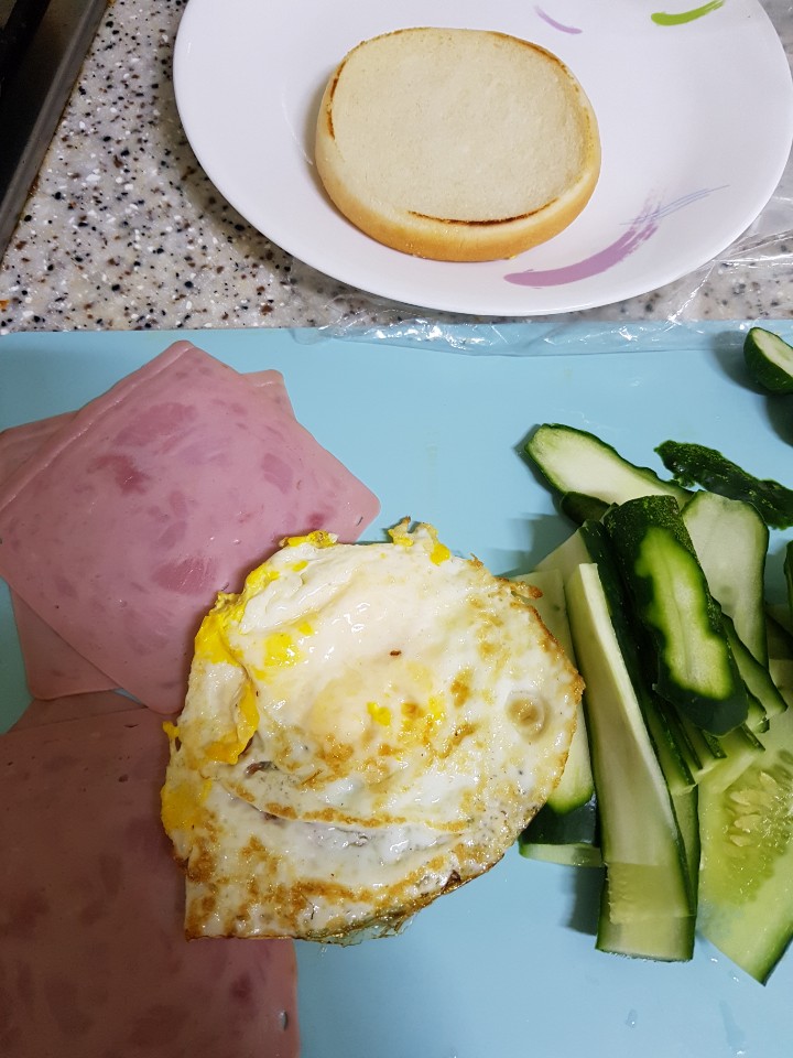 만약 버터나 마요네즈가 있다면 햄버거 빵에 살짝 바른 후 속재료를 얹어주는 것도 좋습니다. 팬에 잘 구운 햄버거 빵위에 샌드위치 햄과 계란을 차례대로 얹어줍니다. 신선한 야채를 추가하고 싶어서 오이도 얇게 썰어서 얹어주었어요.