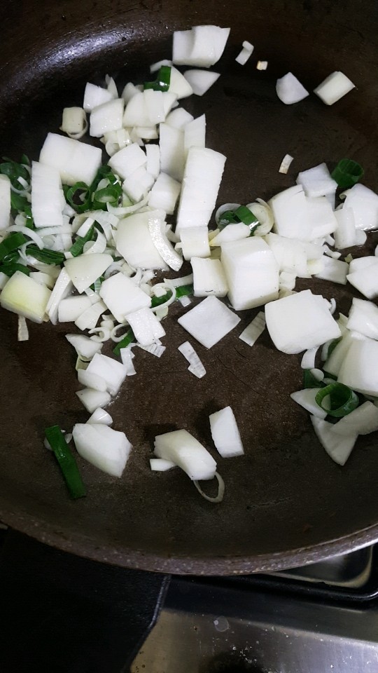 먹기 좋은 크기로 썰어둔 야채들을 기름을 넉넉히 둘러 볶아줍니다. 양파 볶는 냄새는 언제 맡아도 정말 좋아요. 파기름, 양파기름이 넉넉히 나오도록 잘 볶아주고 가지는 제일 나중에 넣어주었습니다. 가지는 그냥 구워먹거나 볶아먹어도 정말 맛있어요. 어릴때는 가지 반찬은 손도 대지 않았는데 이제는 가지가 정말 맛있습니다. 입맛도 변해가는 거 같아요..