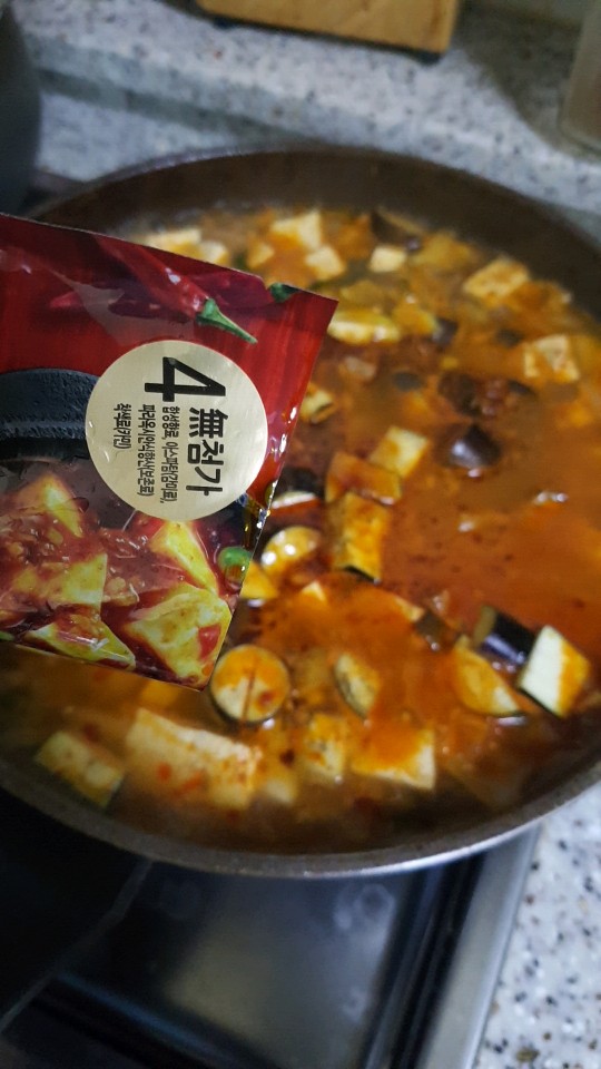 마파두부 소스를 부어주고 설명서에 나온 방법대로 물을 추가했는데 아무리 봐도 좀 이상해 보입니다. 국처럼 왜 이렇게 물이 많지.. 분명히 추가하라고 한대로 정확히 숫자를 맞춰서 추가해 줬는데 하고 보니 대충 휘릭 읽어보느라 잘못 읽었던 단어가 있었습니다. 00큰술 만큼 물을 추가하라고 했는데 무려 00컵 만큼 더 추가해 버린 ㅠㅠ