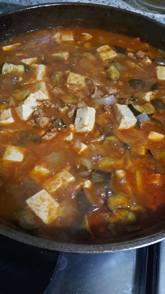 양념된 고기를 최대한 잘게 썰어서 넣고 푹푹 끓여줍니다. 보글보글 끓어오를때 두부도 같이 넣고 계속 졸여주다보니 생각하던 비주얼이 나오기 시작합니다!! 전부다 완성하고보니 묘하게 강된장 같은 느낌이 나기는 했는데 결론은 정말 맛있게 먹었어요 ㅎㅎ