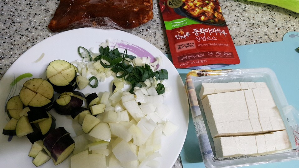 두부, 양파, 파, 가지 그리고 마트에서 팔던 중화마파드부 양념소스가 오늘의 재료입니다. 중국요리점에서 마파두부를 사먹으면 보통은 간고기가 많이 들어있는데 굳이 간고기를 사지는 않았어요. 사실 고기가 들어가지 않아도 맛있을 것 같았지만 돼지고기를 양념에 재워둔 것이 있어 활용해보기로 합니다.