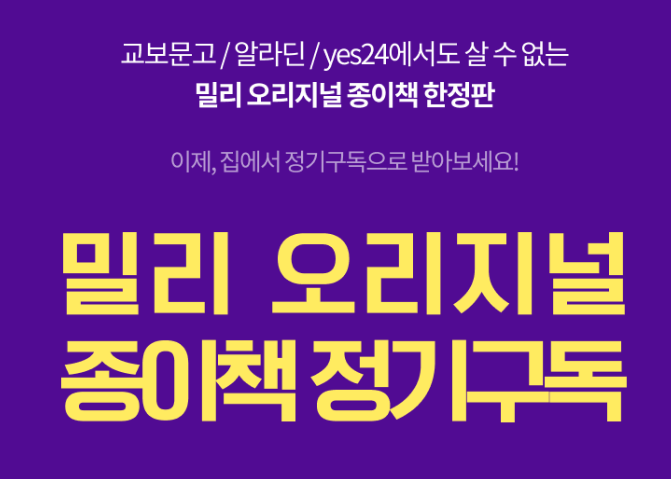 전자책 서비스회사에서 만드는 종이책 정기구독 서비스라니? 매달 내가 지정한 책을 볼 수 있는 건가? 혹은 매달 선정되는 베스트셀러를 보내주는 건가 했더니 일반 출판사에서 출판되는 책들이 아닌 밀리에서 한정판으로 만드는 책들을 잡지처럼 받아볼 수 있는 서비스였습니다.