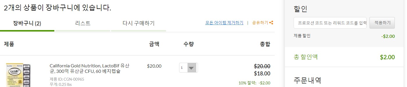 왼쪽에는 주문을 진행하려 하는 상품들의 수량과 금액, 목록 등을 확인할 수 있고 오른쪽에는 할인을 적용할 수 있는 프로모션 또는 리워드 코드를 입력할 수 있는 란이 있습니다. 아이허브에서 진행하는 프로모션과 이벤트에 따라 할인 코드를 입력하면 할인받을 수 있는 금액이 바로 확인됩니다. 해당 부분에 할인이 가능한 코드를 적용하고 나면 할인되는 금액을 확인할 수 있습니다.