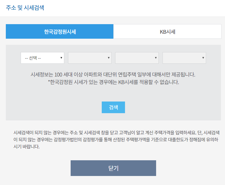 다른 정보들은 간단하게 입력 가능하고 시세의 경우는 한국감정원 혹은 KB시세에서 직접 주소를 입력하여 적용이 가능합니다. 단 , 시세 검색이 되지 않는 경우들이 있는데 100세대 이상 아파트나 대단위 연립주택 일부에 대해서만 제공되는 시세 검색이기때문에 이에 해당하지 않는 주택들은 검색이 불가합니다.