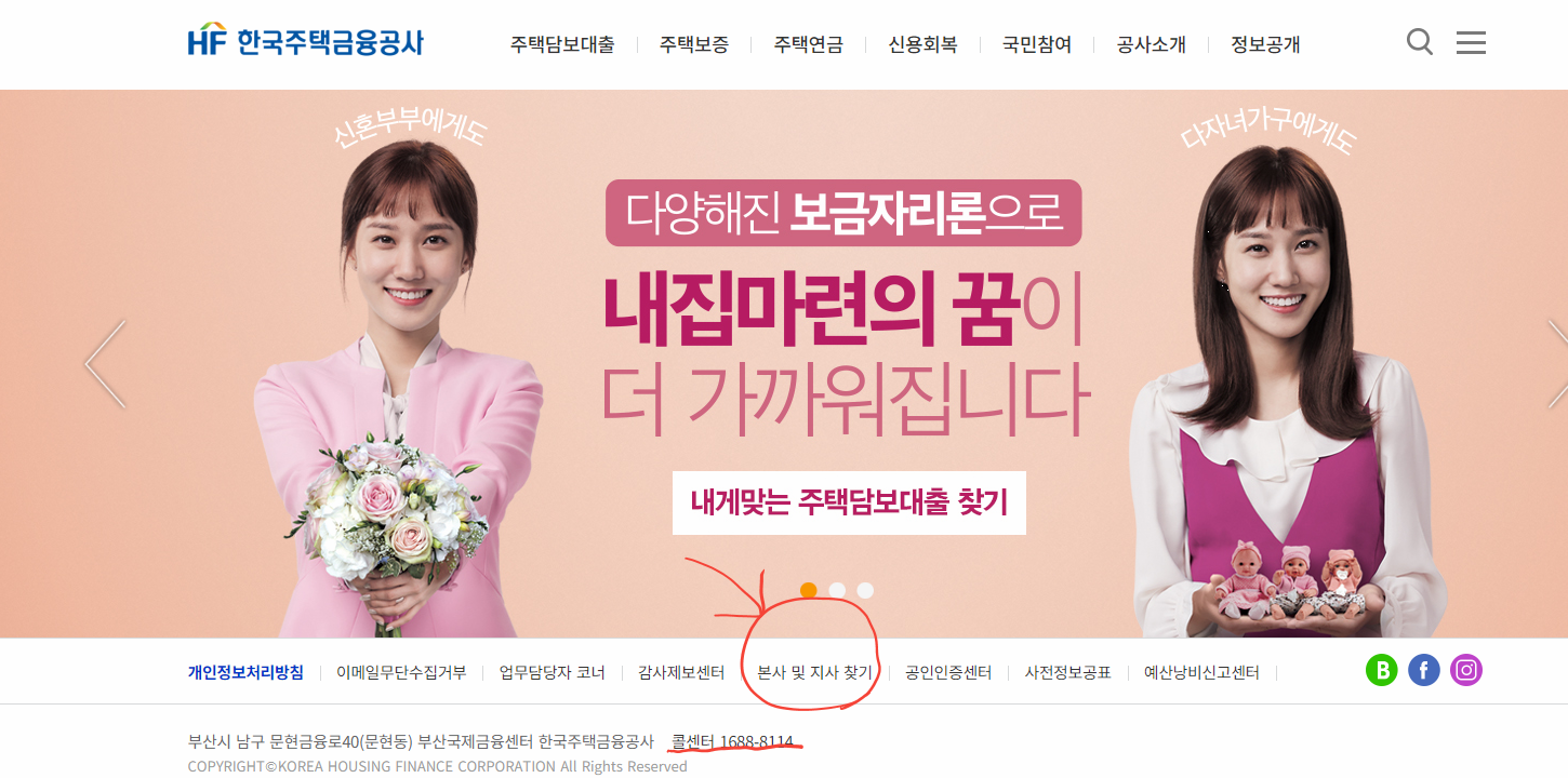 본사 및 지사는 홈페이지 하단의 빨간펜으로 표시된 부분을 클릭하여 관할지역 근처의 지사를 확인할 수 있습니다.