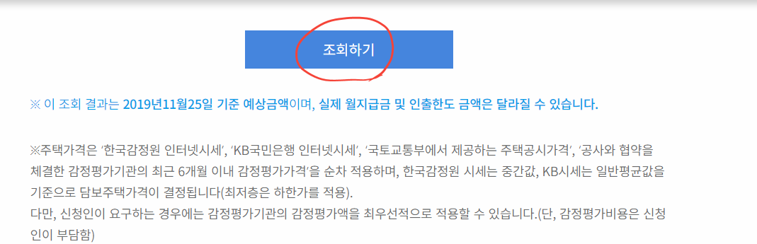 이 경우 현재 예상가능한 시세를 직접 입력하여도 수령액 조회가 가능합니다. 하지만 이 경우에는 감정평평가법인의 감정평가를 통해 산정된 주택평가액을 기준으로 대출한도가 정해지므로 유의하여야 합니다.