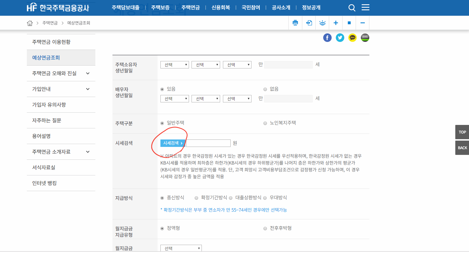 펼쳐진 목록에서 빨간펜으로 표시된 예상연금조회를 클릭후 몇가지 정보를 입력하면 나의 예상 주택연금 수령액이 조회 가능합니다. 그럼 예상연금 조회시 필요한 정보 입력란을 살펴보겠습니다.