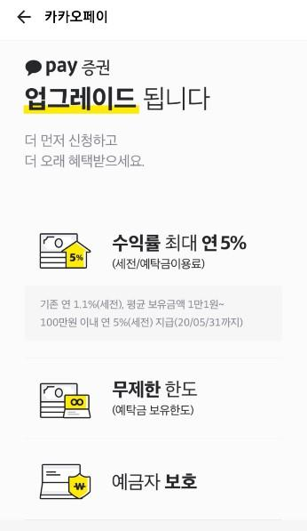 카카오페이를 증권계좌로 업그레이드하고 투자서비스에 펀드, 자산관리 등의 서비스를 제공할 예정이라고 하네요.