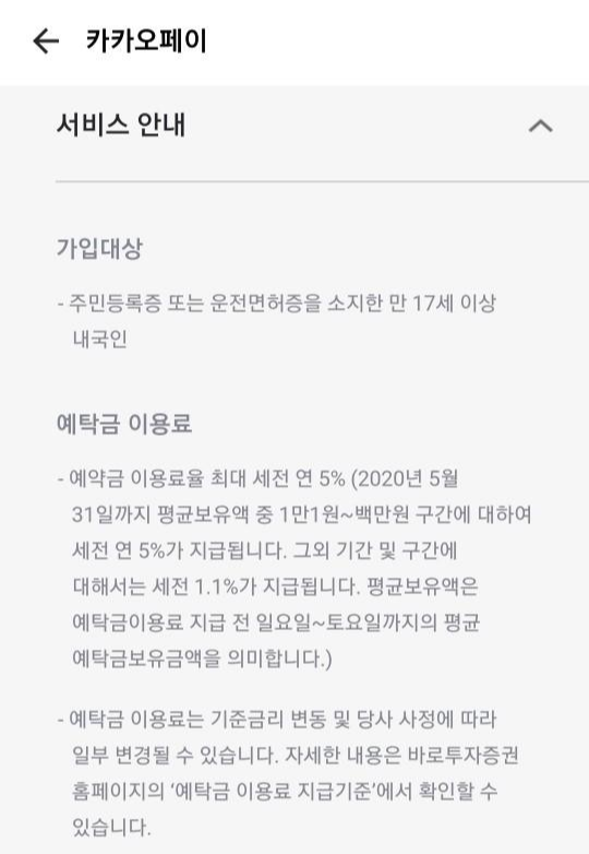 조금 더 자세한 내용을 살펴보자면 카카오페이가 증권계좌로 업그레이드 되기 때문에 카카오페이로 가지고 있는 돈은 CMA나 증권계좌 예치금과 비슷하게 수익을 얻을 수 있습니다. 증권계좌에 예탁금을 예치해두면 증권사에서는 이용료를 은행이자처럼 지급해 줍니다. 이러한 혜택들을 받아볼 수 있고 정해진 기간동안에는 최대 연 5% (세전) 지급, 그 외 기간 및 구간에 대해서는 세전 1.1% 가 지급됩니다.