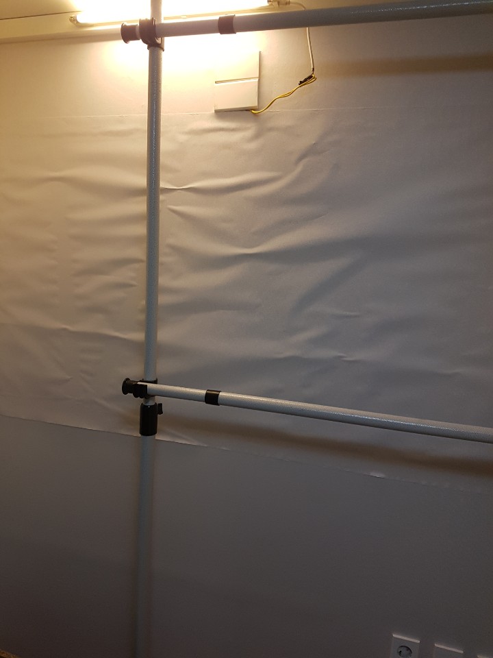 천장에는 커튼봉을 달고 기존에 사용하던 긴창문 커튼을 달았습니다. 현재 이사온 집에는 맞지 않는 너비와 크기라서 구석에 박혀있던 커튼이 제 기능을 하게 되었습니다. 드레스룸과 비슷한 공간을 만들고 싶었는데 수납장을 떼고보니 윗쪽에 은은한 조명이 숨어있어서 위치를 옮겨 붙여두었더니 조명효과도 생겼습니다.