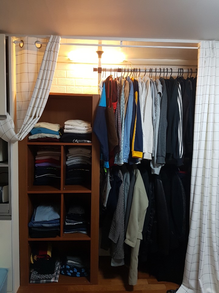 커튼 설치까지 완성한 모습입니다. 평소에는 이렇게 커튼을 쳐두어서 옷이 있는 공간인지 알 수 없습니다. 처음 집을 방문하는 지인들은 이 안쪽은 무슨 공간이냐면서 열어보고 한번씩 놀라더라구요.