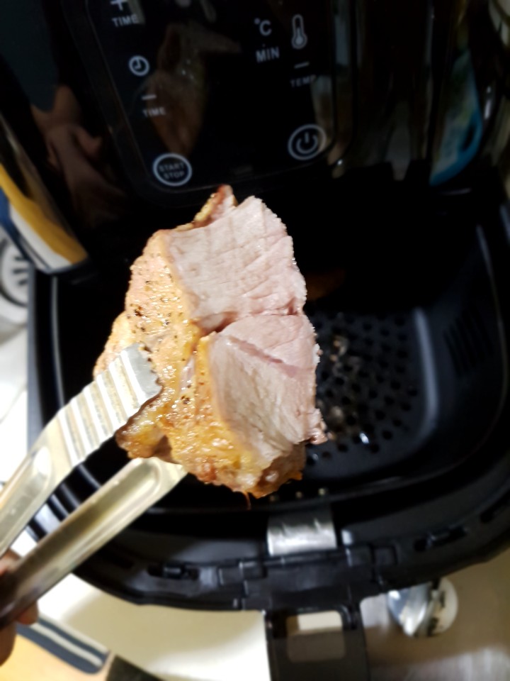 통으로 요리를 할때에는 표면에 오일이나 버터 등을 발라준 후 육즙까지 빠지지는 않도록 요리해 주는 것이 좋을 것 같습니다. 처음 소금, 후추 등으로 간을 할때에 표면에 육즙이 새어나가지 않도록 해준 후 에어프라이어를 사용하면 겉은 바삭하고 속도 퍽퍽하지 않은 삼겹살 요리를 맛볼 수 있습니다.
