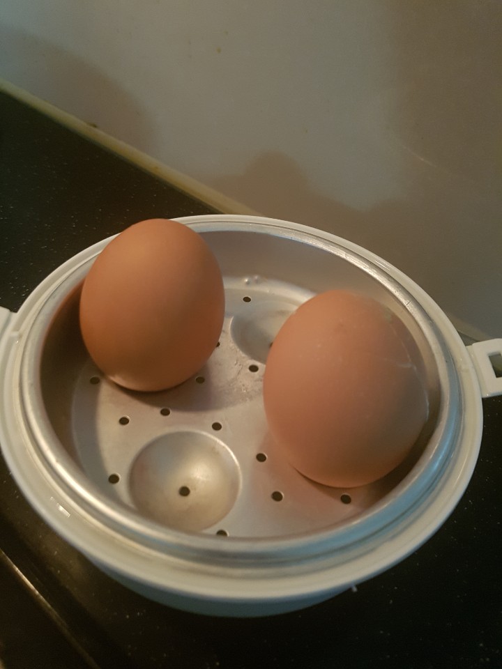 계란 찜기의 밑부분에 표시된 선까지 물을 부어주고 계란을 넣은 후 전자레인지에 돌려주기만하면 끝입니다. 제가 사용하는 찜기는 최대 4개의 계란을 삶을 수 있습니다. 보통 4개를 다 삶아 줄때에는 8분 정도는 돌려주어야 완숙이 되더라구요. 2개의 계란을 반숙과 완숙사이의 상태로 삶아주기 위해서 약 7분을 돌려주었습니다.