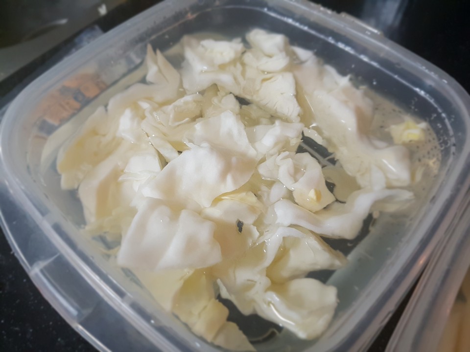 이 날 냉장고에 남아있는 야채라고는 양배추 한종류 뿐이었습니다. 파가 없었다는게 약간 아쉽긴 했지만 냉동실에 구비해둔 마늘이 있어 그나마 위안이 되었습니다.