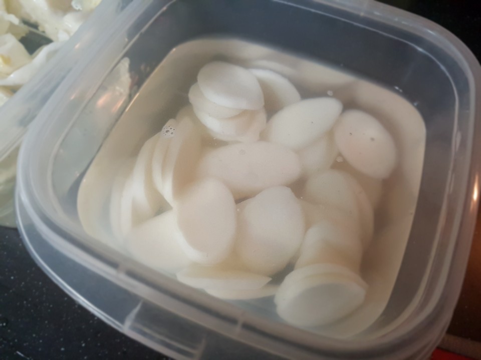 라볶이의 가장 큰 장점 중 하나는 빠른 조리 속도이기 때문에 효과를 높이기 위해서 주로 떡국에 들어가는 떡을 사용합니다. 떡을 꺼내 물에 담구어 두고 들어갈 야채들을 손질하고 소스를 만드는 동안 계속 물에 담구어 둡니다.