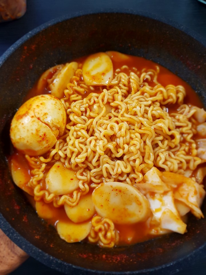 물에 불은 떡과 소스를 넣고 끓어오를때까지 기다린 후 간을 맞춰 줍니다. 이정도만 되어도 떡은 꽤나 말랑하게 어느정도 익은 상태가 됩니다. 라면을 넣게되면 물의 양이 굉장히 빠르게 그리고 많이 줄어들기 때문에 물을 넉넉하게 잡아주는 것이 중요합니다.
