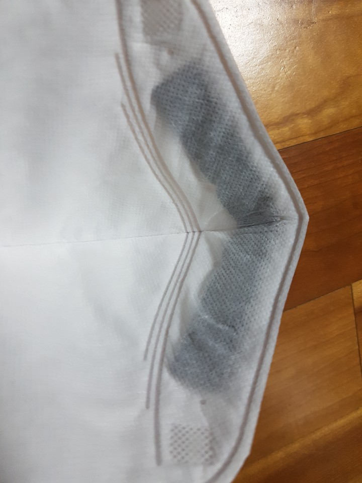 한개씩 개별 포장 되어 있는 마스크 봉투안에는 얼굴에 더 확실하게 밀착시키기 위해 귀에 달린 끈을 서로 연결시킬 수 있는 플라스틱 고리가 들어있습니다. 처음에는 마스크에 직접 부착되어 있지 않아서 봉투 안에 플라스틱 클립이 있는 줄 몰랐는데 마스크 포장지를 읽어보니 플라스틱 고리가 포함되어 있더라구요. 플라스틱 고리를 사용하는 경우 얼굴 표면에 더 잘 밀착되는 이점이 있지만 머리카락이 엉키기도 하고 조금 불편한 느낌도 있었습니다.