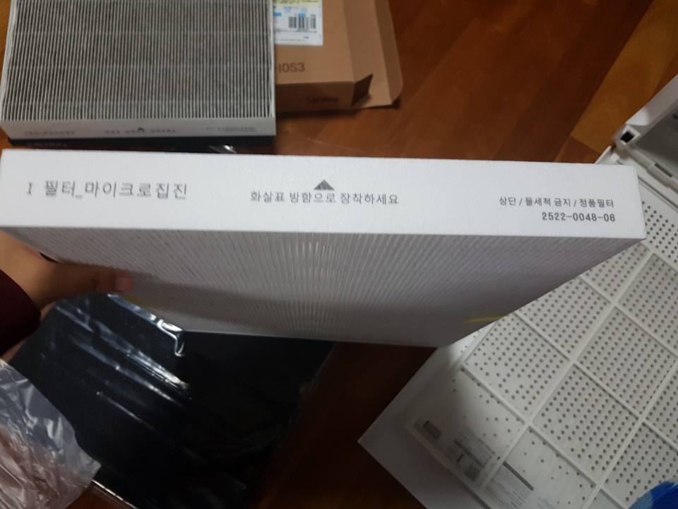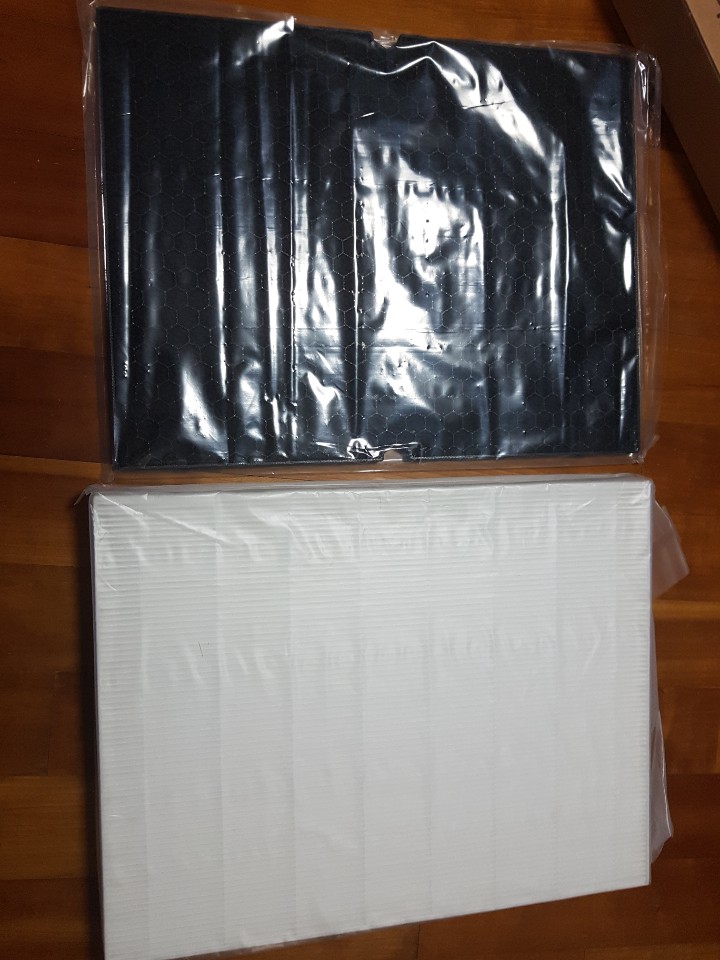 깔끔하게 탈취필터 + 마이크로 집진필터 각각 한개씩 개별 포장되어 박스안에 들어있습니다. 필터 교체를 위해 기존 필터를 제거하고 프리필터도 물세척을 해줍니다.