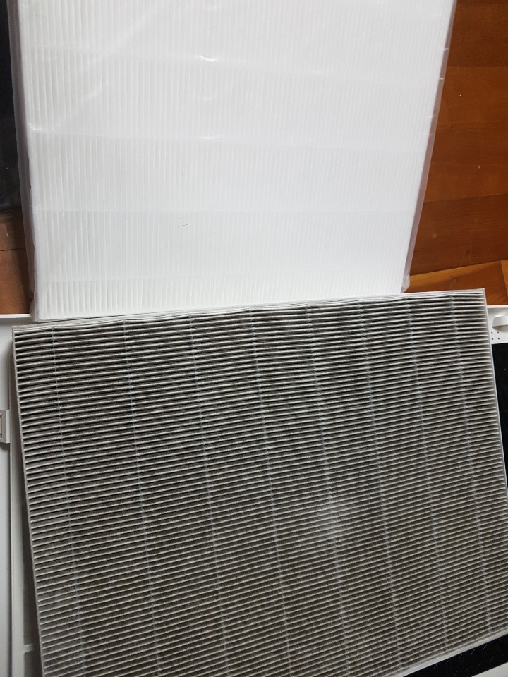 필터교체를 하다가 정말 깜짝 놀랐습니다. 너무나 극명하게 대비되는 새 필터와 교체해야하는 필터의 색차이... 공기청정기가 제 역할을 열심히 하고 있었다는 안도감과 함께 한편으로는 이정도 상태가 되어도 제기능을 할 수 있을까 싶기도 합니다.
