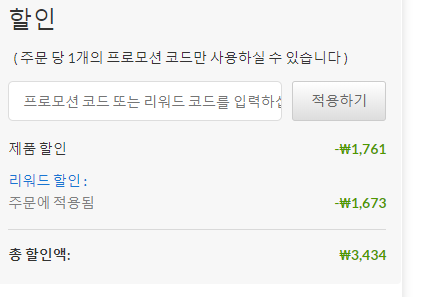 할인코드 ANJ0512 를 입력한 후 적용하기 버튼을 누르면 자동으로 리워드 할인이 적용되며 총 할인액을 확인할 수 있습니다.