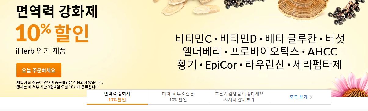 아이허브에서는 매달 각종 이벤트 행사나 리워드 행사를 하고 있는데요. 현재 진행되고 있는 기획전은 면역력 강화제 10% 할인, 헤어,피부&손톱 10% 할인 이 있습니다. 해당 할인 행사 리스트에 포함되어 있는 상품들 중에는 세일 제외 되는 상품이 있을 수 있고 중복할인은 적용되지 않습니다. 미 서부 시간 3월 4일 오전 10시에 종료 되는 행사 들로 이후에는 새로운 행사가 진행될 것으로 보입니다.