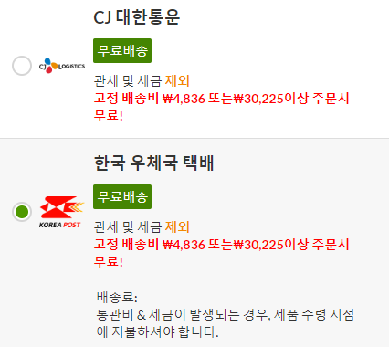 요즘은 아이허브 배송료가 예전에 구매할때에 비해 많이 저렴해 졌습니다. 현재는 구매하는 총 금액이 25$ 이상인 경우 무료배송 25$ 미만인 경우 4$ 의 고정배송비가 발생합니다. 구매 후 선택할 수 있는 택배사는 대한통운, 우체국이 있습니다.