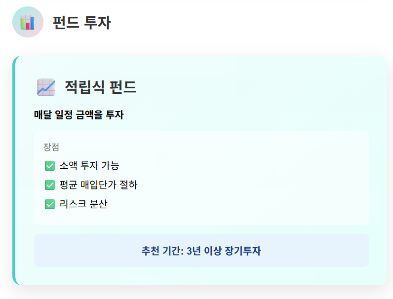 반면, 펀드는 상품의 특성과 투자 기간, 시장 흐름에 대한 이해가 어느 정도 필요하므로, 본격적으로 자산을 늘리고자 할 때 고민해볼 수 있는 투자 수단입니다. 적립식 펀드를 통해 소액으로 시작해도 충분하며, 시황을 잘 분석하면 거치식 펀드로 단기 수익도 노려볼 수 있습니다.