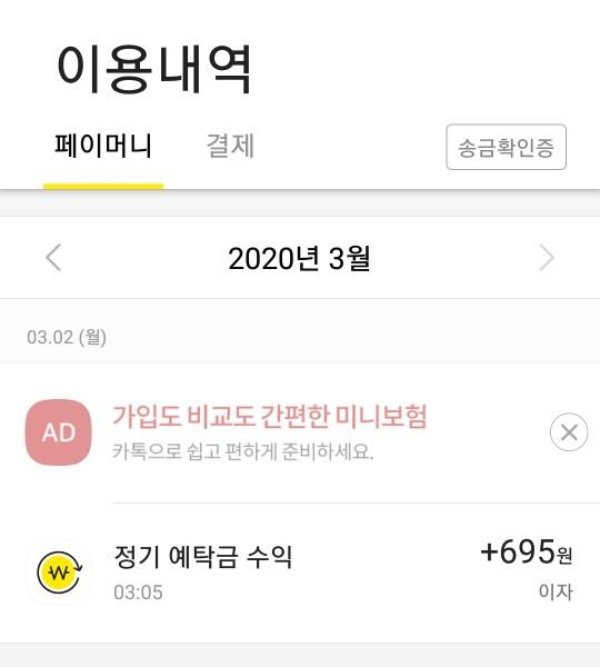 3월 처음 들어온 정기 예탁금 수익은 695원 입니다.