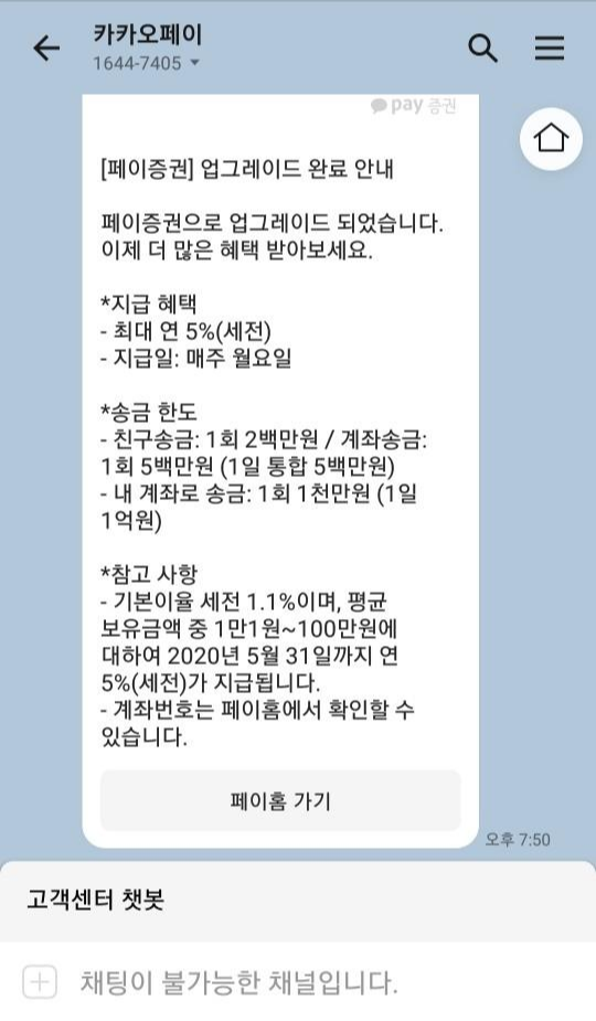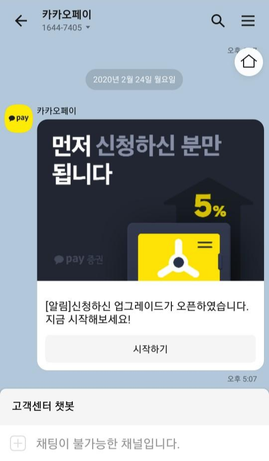 얼마전 카카오페이에서 기존 카카오페이 계좌를 증권계좌와 연계하여 카카오페이 증권으로 업데이트 되는 서비스가 시행될 것을 공지했습니다. 그때 사전 신청을 미리 해두었고, 얼마전 업데이트 진행 안내 문자를 받아 업데이트를 완료했습니다.