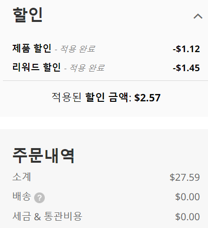 제품에 따라 할인율은 달라질 수 있지만 5~10% 의 할인을 받을 수 있습니다. 여러병 구매시 기존할인율 + 중복할인이 가능하며 총 25$ 이상 주문하면 무료배송입니다. 구매금액이 25$이 되지 않더라도 4$의 배송료만 지불하면 되니까 해외직배송의 배송료치고도 저렴한 편입니다.